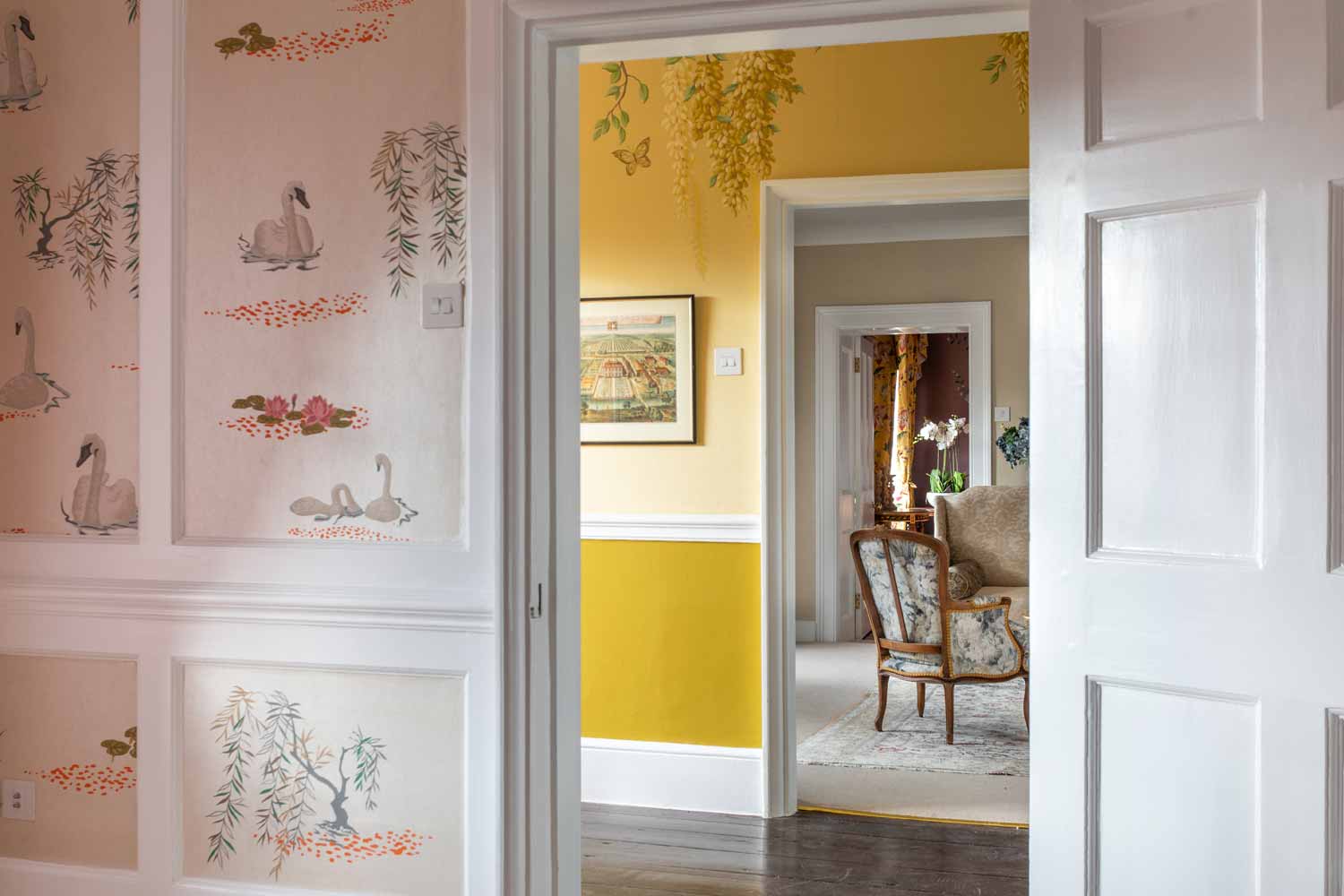 Our latest project included bespoke hand painted silk wallpapers installed on a Grade 2 listed Georgian manor house in Cornwall.